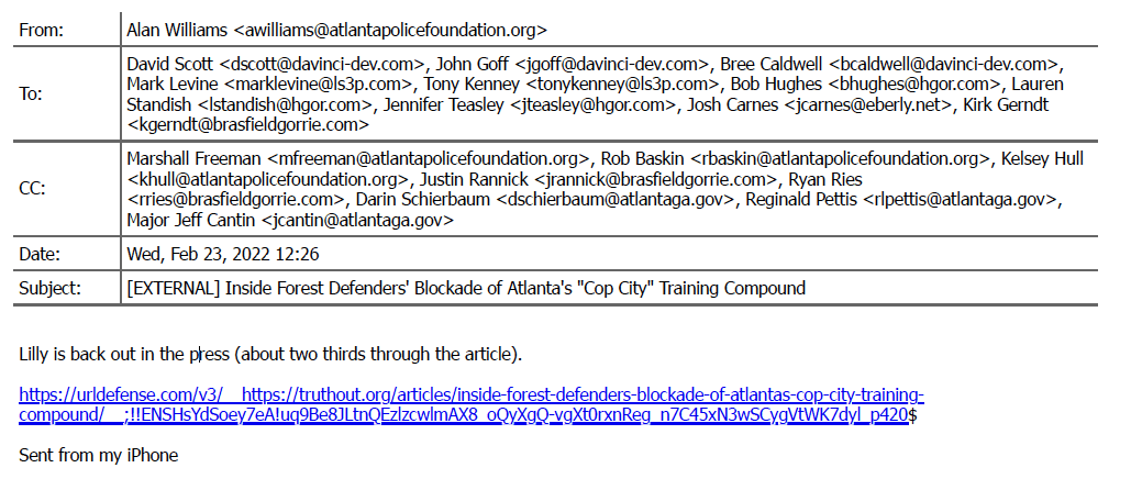 Dislike for Ponitz’ appearances in news reports likewise existed within APF brass. In another email obtained through a GORA request, APF employee and project manager for the Cop City project Alan Williams alerted members of Cop City design, architecture, landscape, and contractor firms as well as Atlanta Police Department (APD) officers and other APF leadership to Truthout Article highlighting the opponents of the Cop City project, known as Forest Defenders. Notably, Williams included now Acting Chief of Police Darin Schierbaum (at the time, Scheirbaum was Deputy Chief of Police), who is a member of the CSAC, but did not include any other committee members.