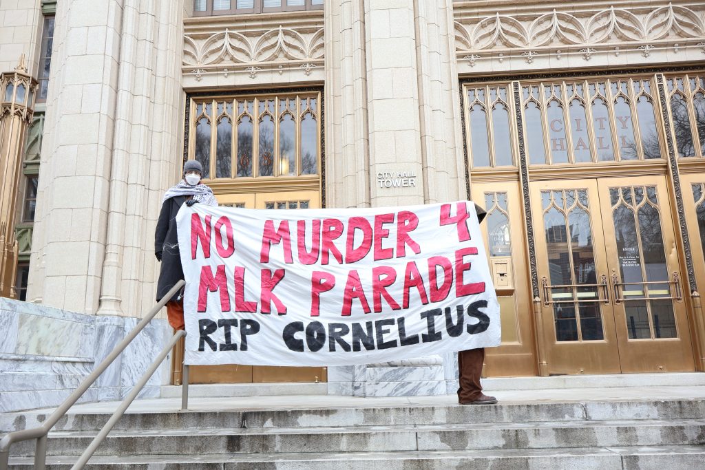 Organizers made a banner that read, “No Murder for MLK Parade. RIP Cornelius” and hung it outside the encampment.