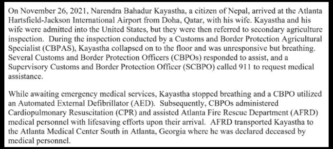 Atlanta Fire and Rescue Department (AFRD) medical personnel eventually arrived and joined in CBP officers’ efforts to save Kayastha’s life. AFRD transported him to Atlanta Medical Center – South, where he was pronounced dead.