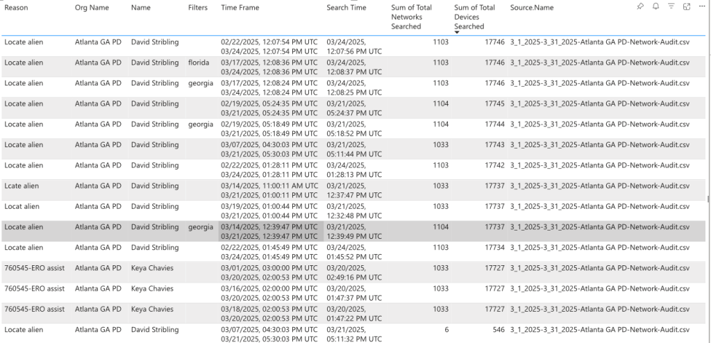 Records of the audit show that between March 20 and March 24, two individuals using APD credentials conducted 15 searches of the interconnected Flock network using the terms “locate alien” and “ERO assist,” the latter likely a reference to ICE’s Enforcement Removal Operations division.
